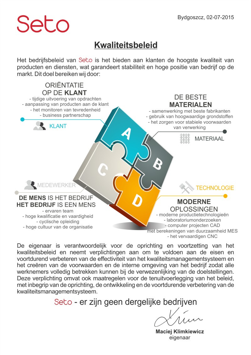 Onze hoogste prioriteit is klanttevredenheid en hun vertrouwen in de hoge kwaliteit van onze producten. Onze aanpak van kwaliteitsmanagement wordt volledig weerspiegeld in ons Kwaliteitsbeleid.